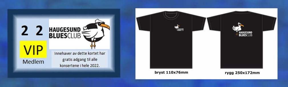 VIP-kort og T-skjorte fra Haugesund BluesClub. Dette gir vinneren gratis adgang til alle konsertene som Haugesund BluesClub arrangerer i 2023. T-skjorten er i valgfri størrelse og farge. Vi har for tiden fargene svart, blå og hvit. Verdi 3900,-