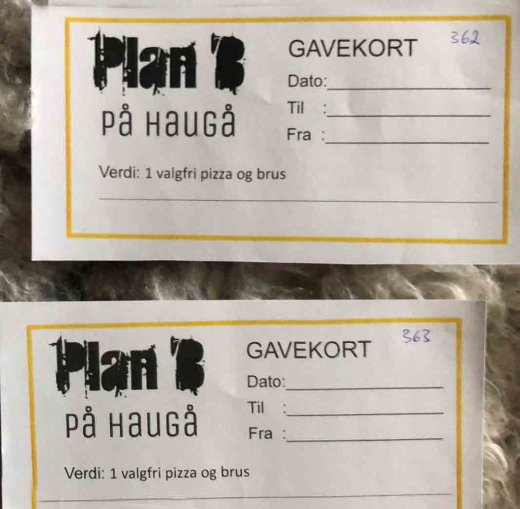 1 gavekort hver til 2 vinnere på 1 valgfri pizza og brus gitt av Plan B på Haugå . Verdi ca. 180,-