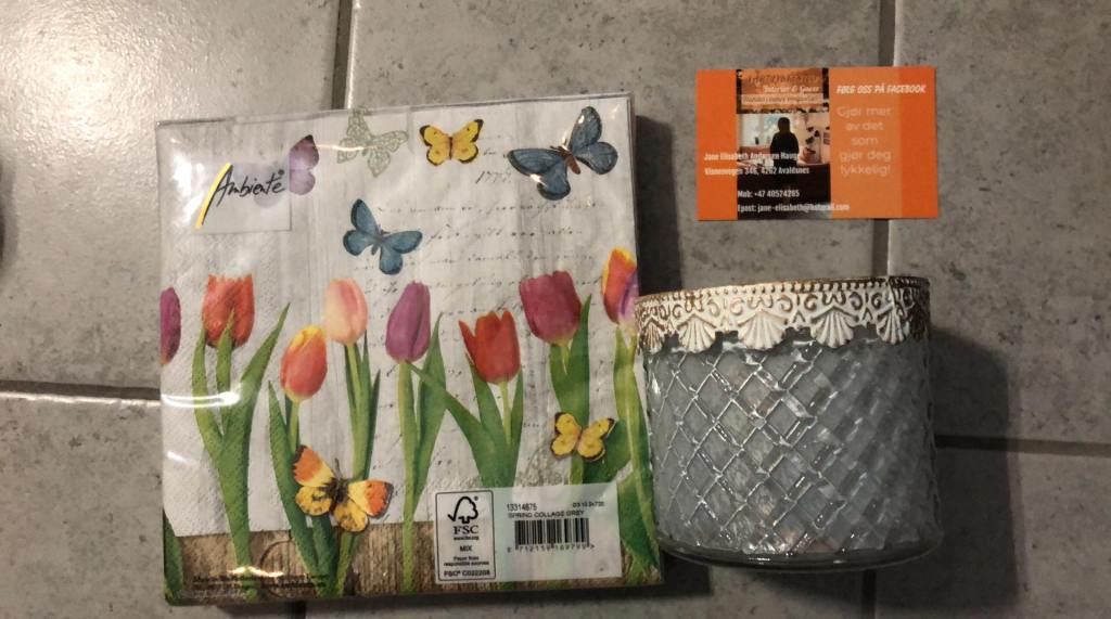 Servietter og t-lysestake gitt av Vårt Lykkested Interiør & Gaver. Verdi 100,-